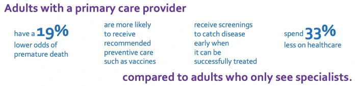 Primary care is your first point of entry into the medical system when you have a new health issue that hasn’t been diagnosed yet, and it’s where you go for preventive care, health screenings, and treatment for chronic conditions. Research has shown that people who have a primary care provider (PCP) are healthier, go to the emergency room less often, and live longer.